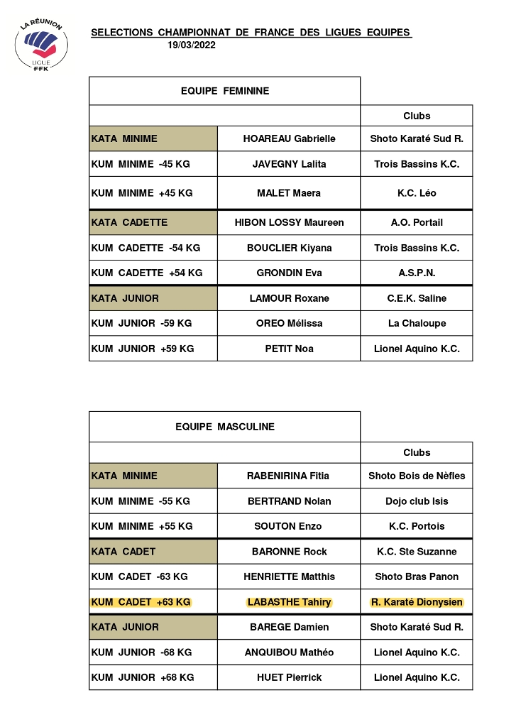 les Entraineurs Régionaux de la Ligue ont publié la liste des sélectionnés des Équipes Féminine et Masculine en Minimes-Cadets-Juniors.