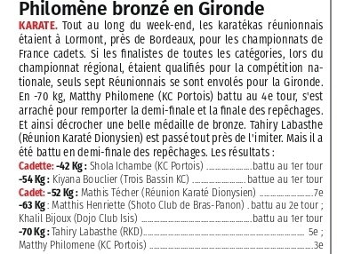 Cadet -70 Kg : LABASTHE TAHIRY = 1er Tour (8-0) – 2T (8-0) – 3T (5-4) – perd 4T demi – perd la finale repêchage = 5ème